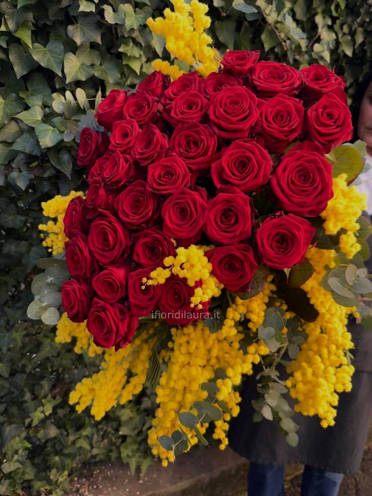 Si tratta di un bouquet scenografico, pensato per un’occasione importante: unisce la passione e l’eleganza delle rose alla simbologia della mimosa, creando una composizione ricca, strutturata e di grande presenza.