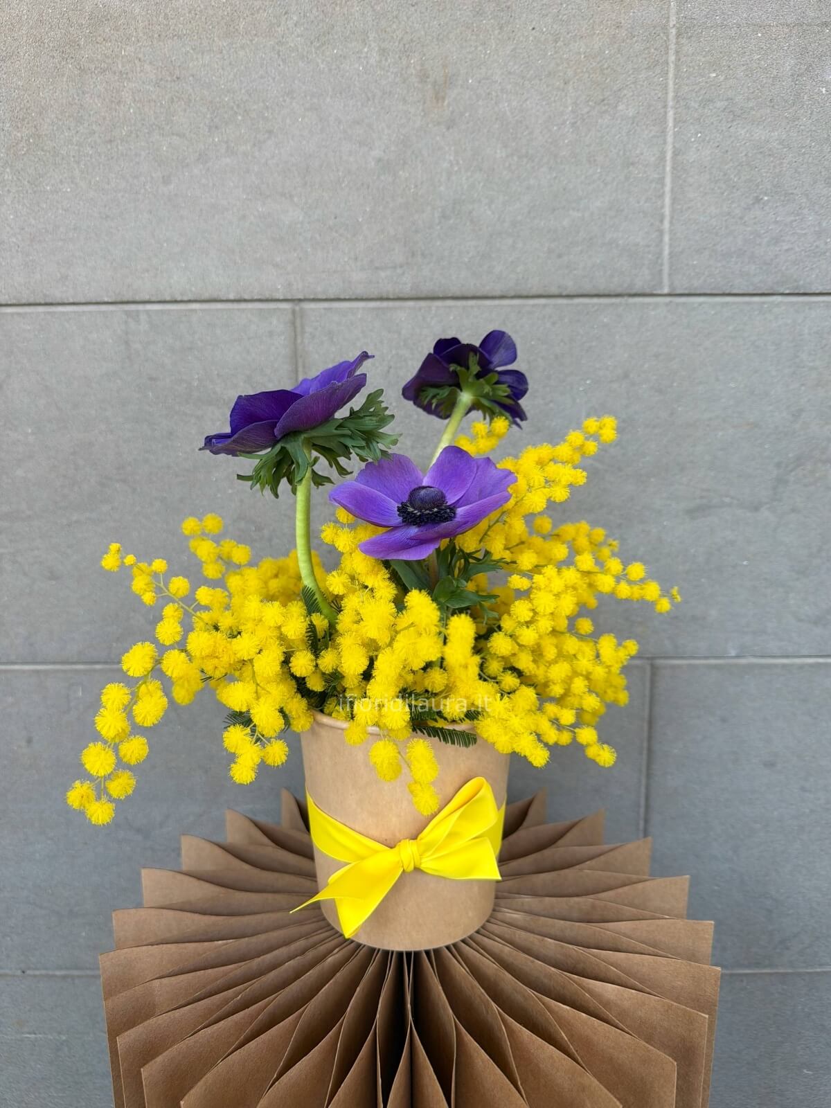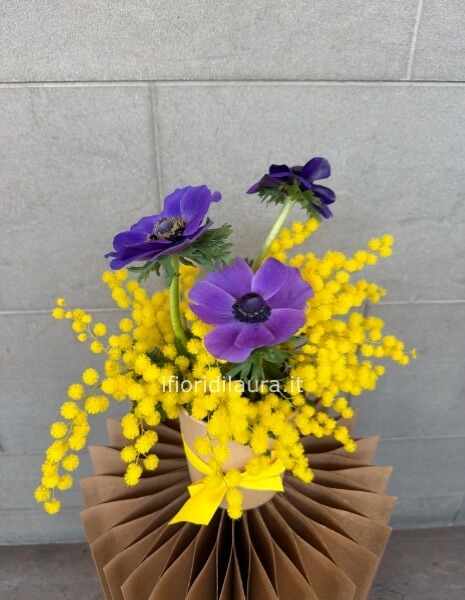 Questa composizione unisce la luminosità della mimosa alla profondità elegante degli anemoni viola. La base è formata da un’abbondante massa di mimosa fresca, con i suoi piccoli fiori giallo intenso che creano volume e leggerezza.
