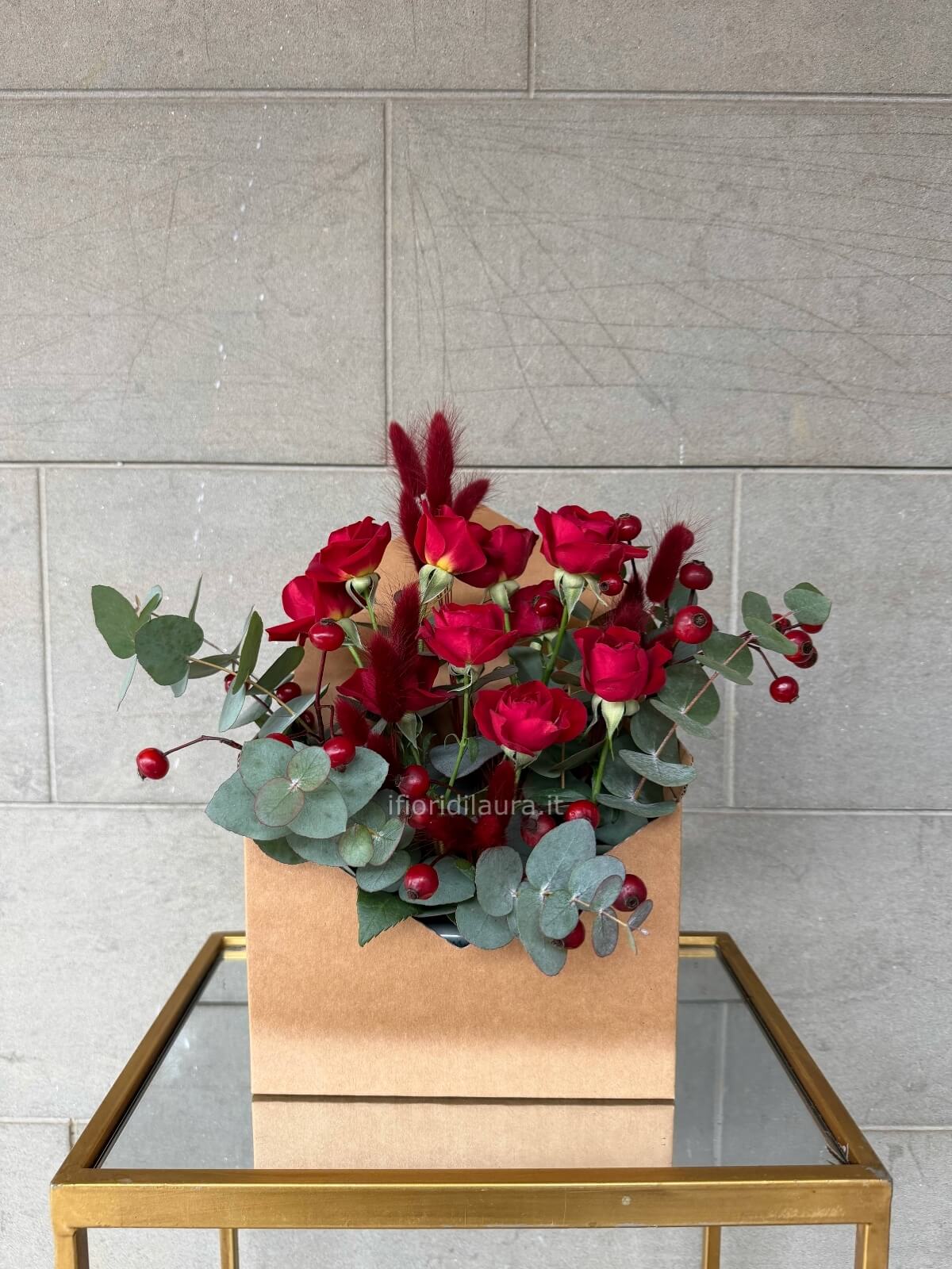 Elegante composizione a forma di lettera con rose rosse e verde decorative.