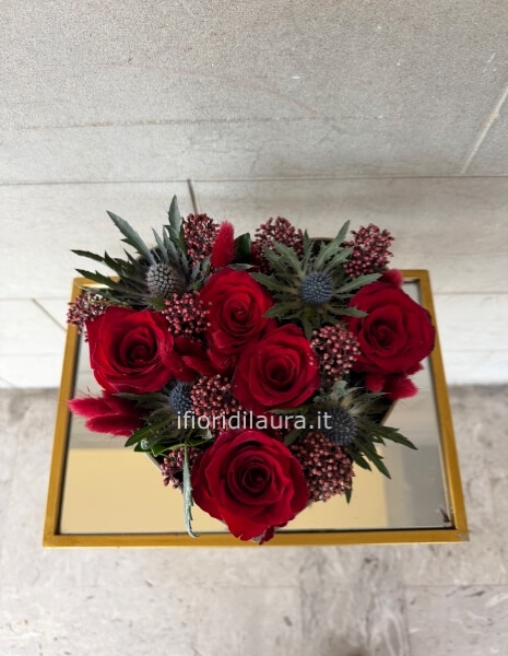 Questa soluzione è pensata per offrire praticità ed eleganza, mantenendo un alto livello estetico. La composizione è adatta sia come dono personale sia come elemento decorativo per ambienti interni, grazie alla sua struttura compatta e alla cura dei dettagli.