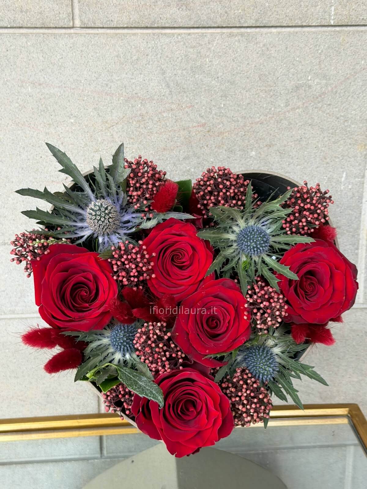 L’abbinamento tra le rose e gli elementi floreali decorativi valorizza la composizione, conferendole un aspetto ordinato e ricercato. La forma a cuore rende il prodotto immediatamente riconoscibile e adatto come regalo simbolico, perfetto per chi desidera un’alternativa moderna al bouquet tradizionale.