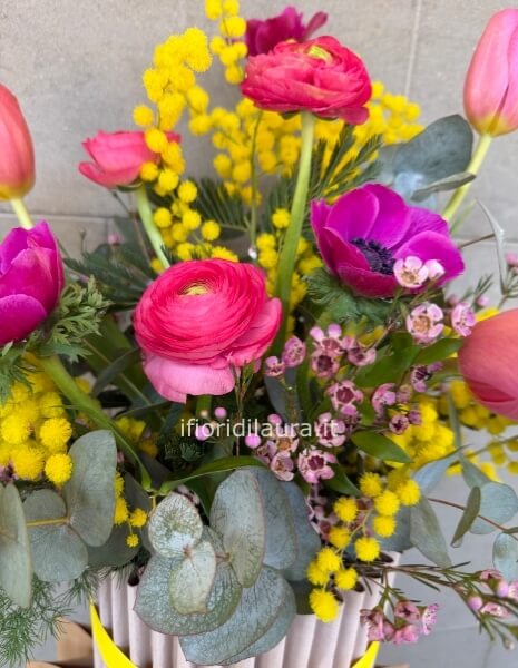Tra la mimosa spiccano tulipani rosa dalle linee morbide e delicate, insieme a ranuncoli fucsia e piccoli fiorellini lilla che aggiungono profondità e contrasto. Le foglie di eucalipto, con il loro verde polveroso e rotondo, bilanciano i colori vivaci e rendono l’insieme armonioso e raffinato.