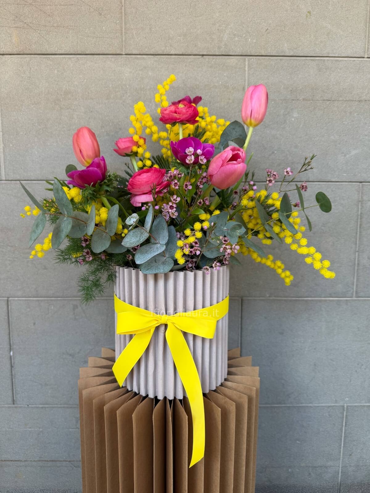 Il bouquet è sistemato in un contenitore cilindrico color tortora con superficie ondulata, decorato da un grande fiocco giallo brillante che richiama la mimosa e rende il tutto ancora più festoso. La base in carta kraft piegata a fisarmonica aggiunge un tocco moderno e artigianale.