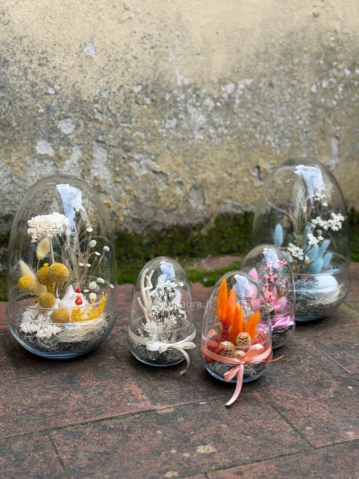 Elegante e raffinato, questo uovo decorativo in vetro racchiude al suo interno una delicata composizione floreale dai toni primaverili. Fiori secchi bianchi e dettagli azzurri si intrecciano armoniosamente creando un piccolo giardino protetto, simbolo di rinascita e bellezza.